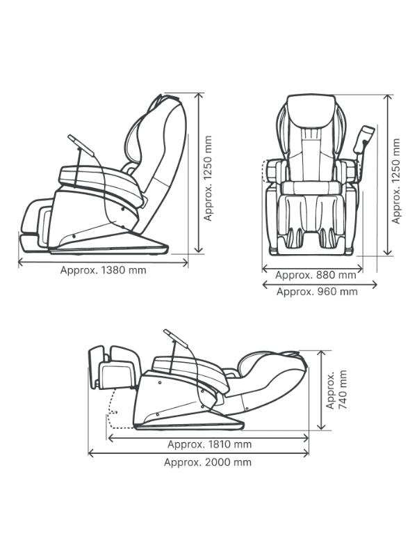 - La poltrona massaggiante Fujiiryoki ha dimensioni principali di circa 760 x 1.380 x 1.250 mm in larghezza e 1.250 mm in altezza quando e nella posizione iniziale.