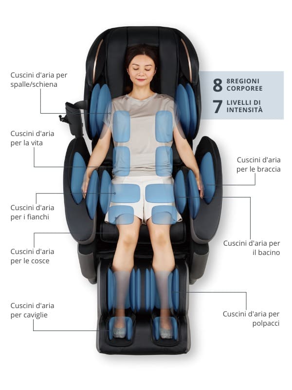 Grazie al pionieristico Doppio Sensore e all'Intelligenza Artificiale +, questa poltrona massaggiante si concentra con precisione su 8 punti critici della schiena. Una sinfonia di tecnologia orchestrata dall'ottimizzazione automatica garantisce che ogni massaggio superi le aspettative. La capacità intrinseca della poltrona di rilevare la posizione delle spalle e l'allineamento della colonna vertebrale assicura un viaggio rilassante e personalizzato.