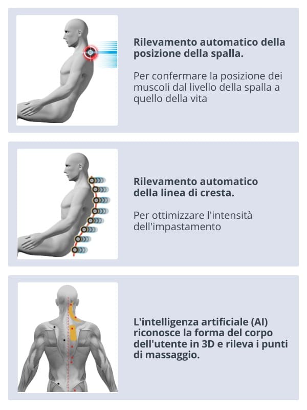 Il cuore della poltrona massaggiante Fujiiryoki JP-3000 è una rivoluzionaria tecnologia ad Intelligenza Artificiale. Analizza fluidamente la curva della colonna vertebrale, le condizioni muscolari e le esigenze specifiche del corpo, creando un'esperienza di massaggio unica ed eccezionale. Dall'intensità alla tecnica, ogni sfumatura è armoniosamente personalizzata per un benessere ottimale.