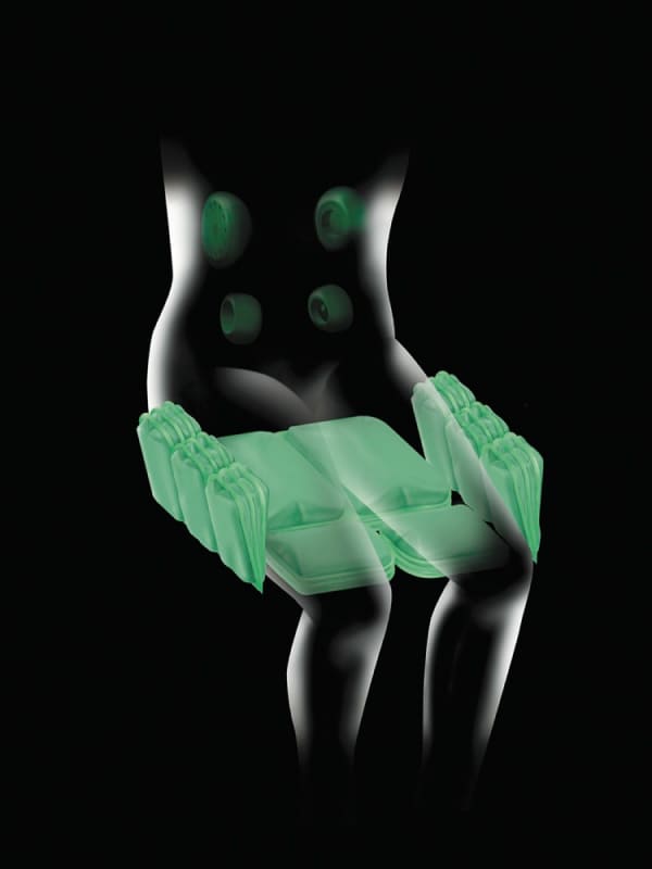 - Durante il massaggio, le celle d'aria sono posizionate sulla superficie del sedile, mentre le celle d'aria per i polpacci lavorano in sincronia. Questo aiuta a spingere verso l'alto e ad allungare il lato posteriore delle cosce, nonché a distendere il lato posteriore delle ginocchia.